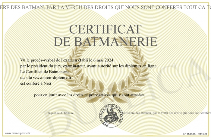 Envoyez par email votre Certificat de Batmanerie personalisé
