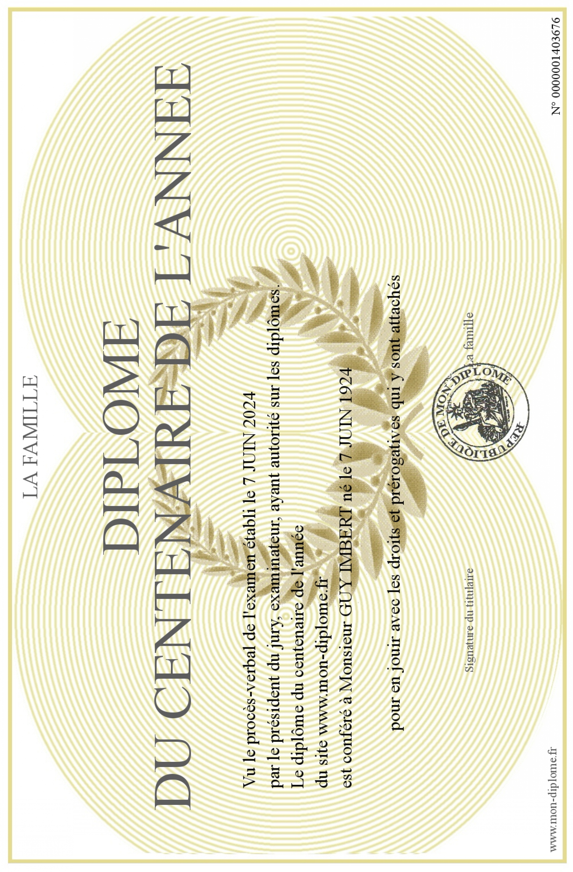 Envoyez par email votre Diplôme du CENTENAIRE DE L'ANNEE personalisé
