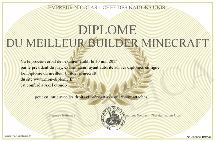 Envoyez par email votre Diplôme du meilleur builder minecraft personalisé