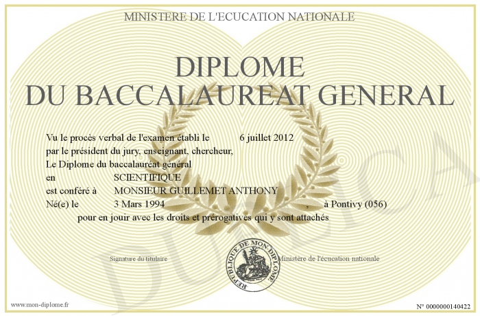 Envoyez par email votre Diplôme du baccalauréat général personalisé