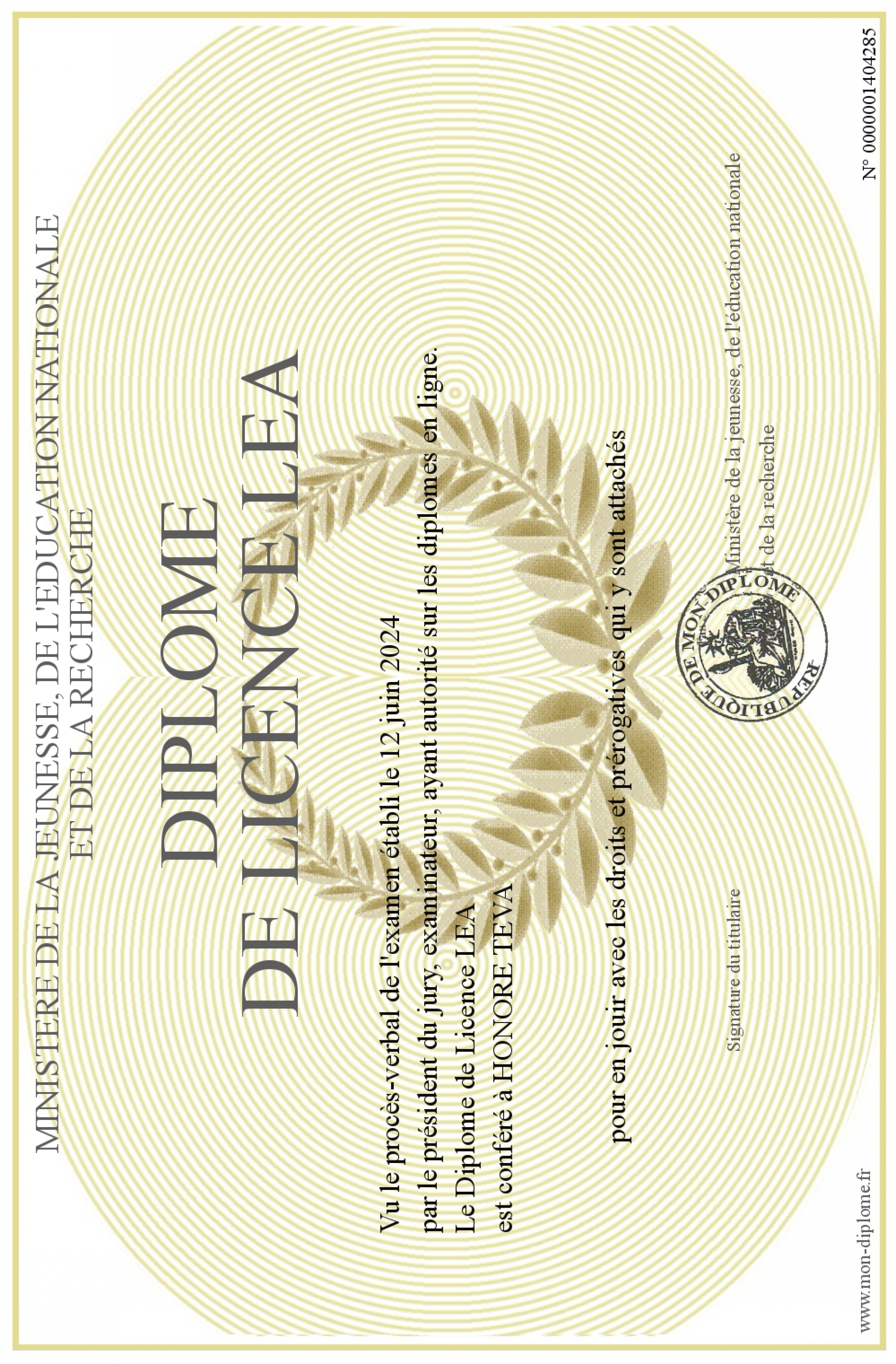 Envoyez par email votre Diplôme de Licence LEA personalisé