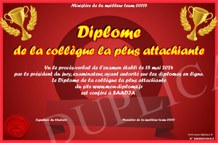 Envoyez par email votre Diplôme de la collègue la plus attachiante personalisé