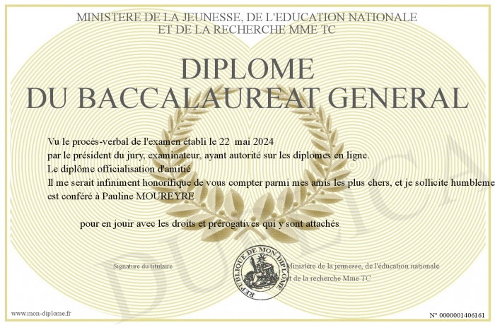 Envoyez par email votre Diplôme du baccalaureat général personalisé