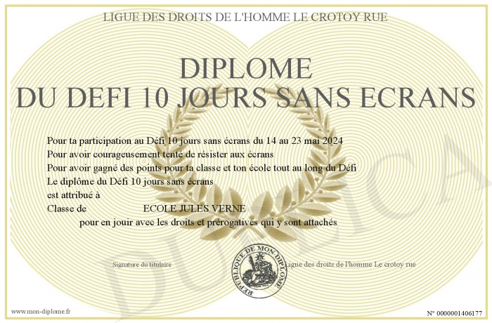 Envoyez par email votre Diplôme du Défi 10 jours sans écrans personalisé