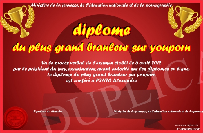 Envoyez par email votre diplôme du plus grand branleur sur youporn personalisé