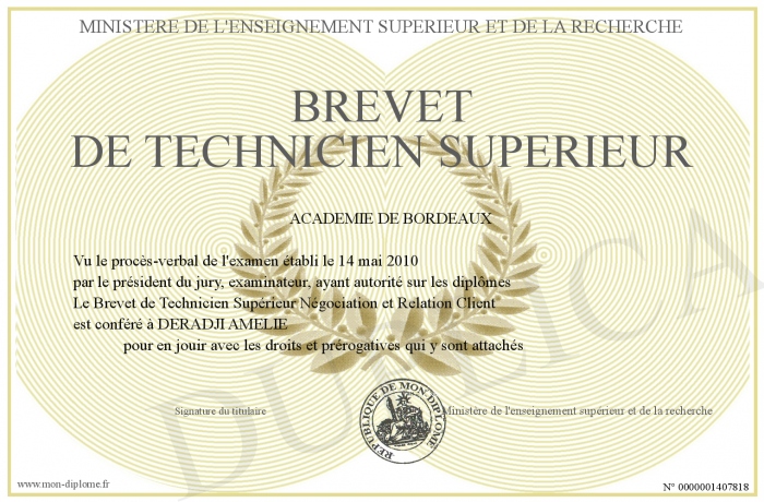 Envoyez par email votre Brevet de Technicien Supérieur personalisé