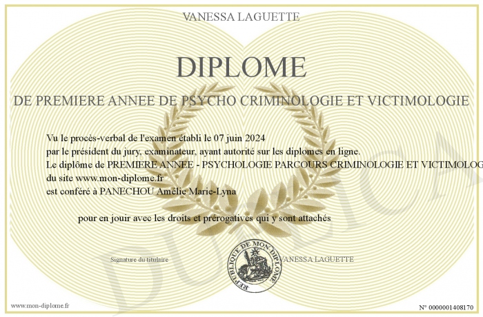 Envoyez par email votre Diplôme de Première Année de Psycho criminologie et Victimologie personalisé