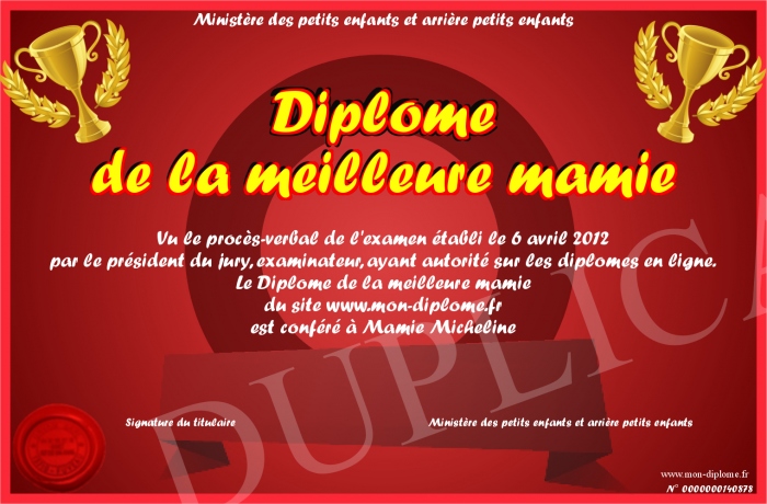 Envoyez par email votre Diplôme de la meilleure mamie personalisé