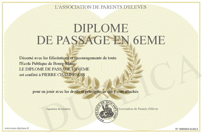 Envoyez par email votre Diplôme de passage en 6ème personalisé