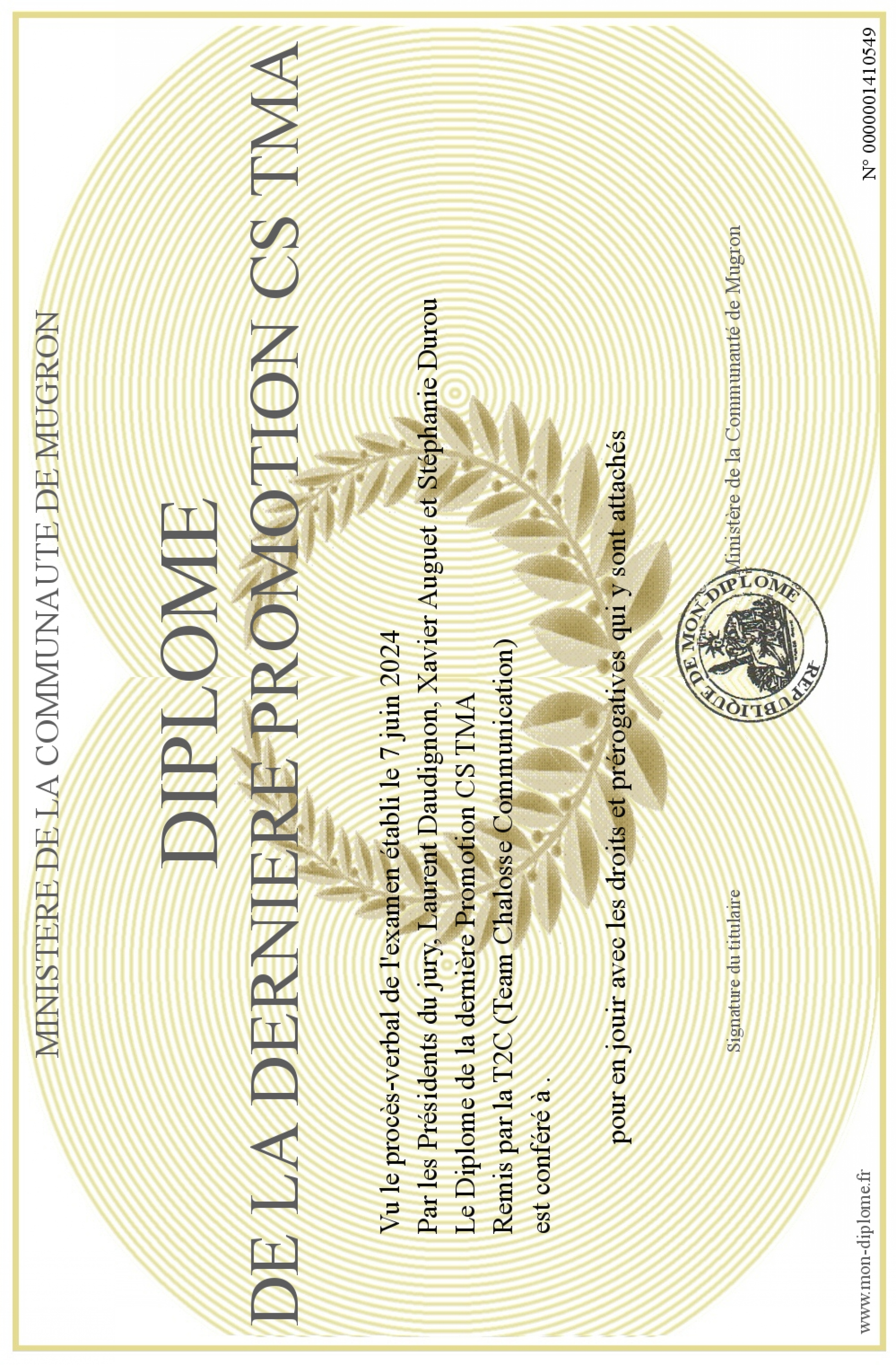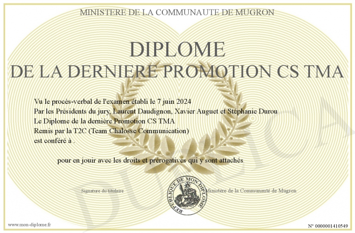 Envoyez par email votre Diplôme de la dernière Promotion CS TMA personalisé