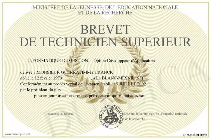 Envoyez par email votre BREVET DE TECHNICIEN SUPERIEUR personalisé