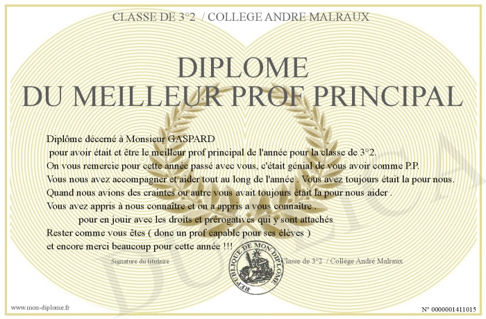 Envoyez par email votre Diplôme du meilleur prof principal personalisé
