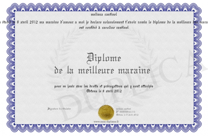 Envoyez par email votre Diplôme de la meilleure maraine personalisé