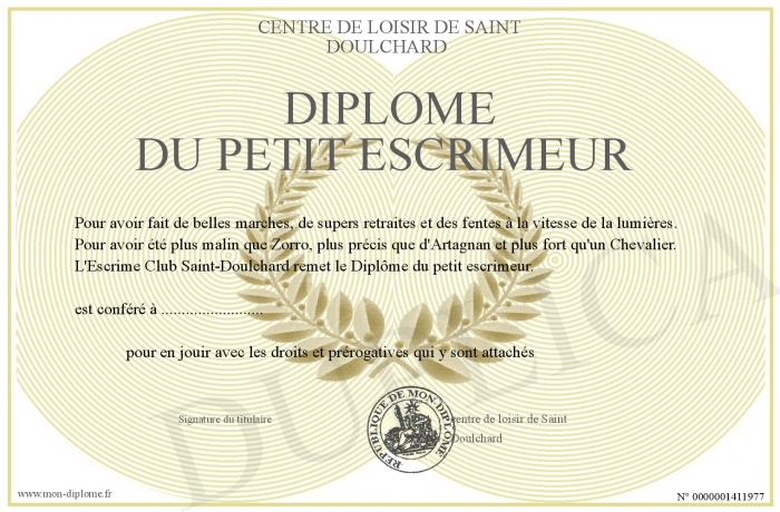 Envoyez par email votre Diplôme du petit escrimeur personalisé