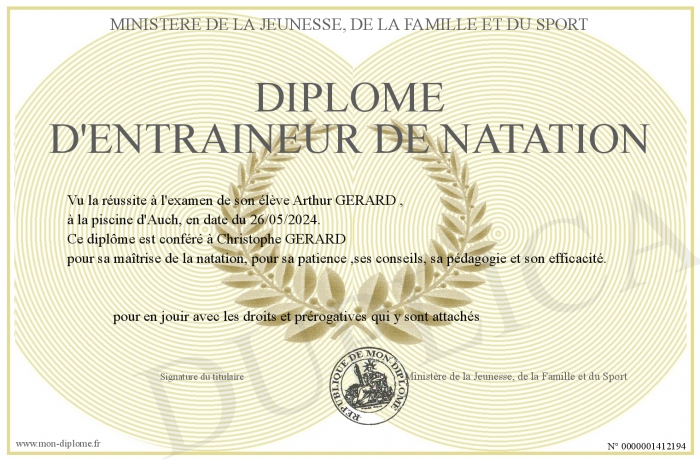 Envoyez par email votre Diplôme d'entraineur de natation personalisé