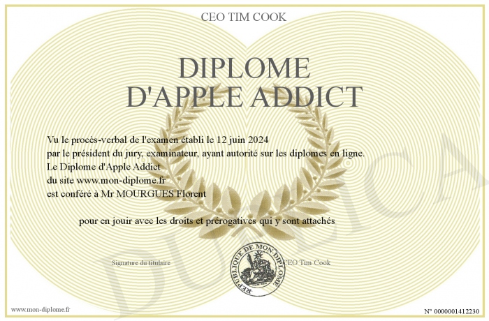 Envoyez par email votre Diplôme d'Apple Addict personalisé
