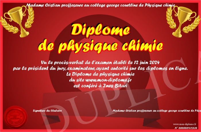 Envoyez par email votre Diplôme de physique chimie personalisé
