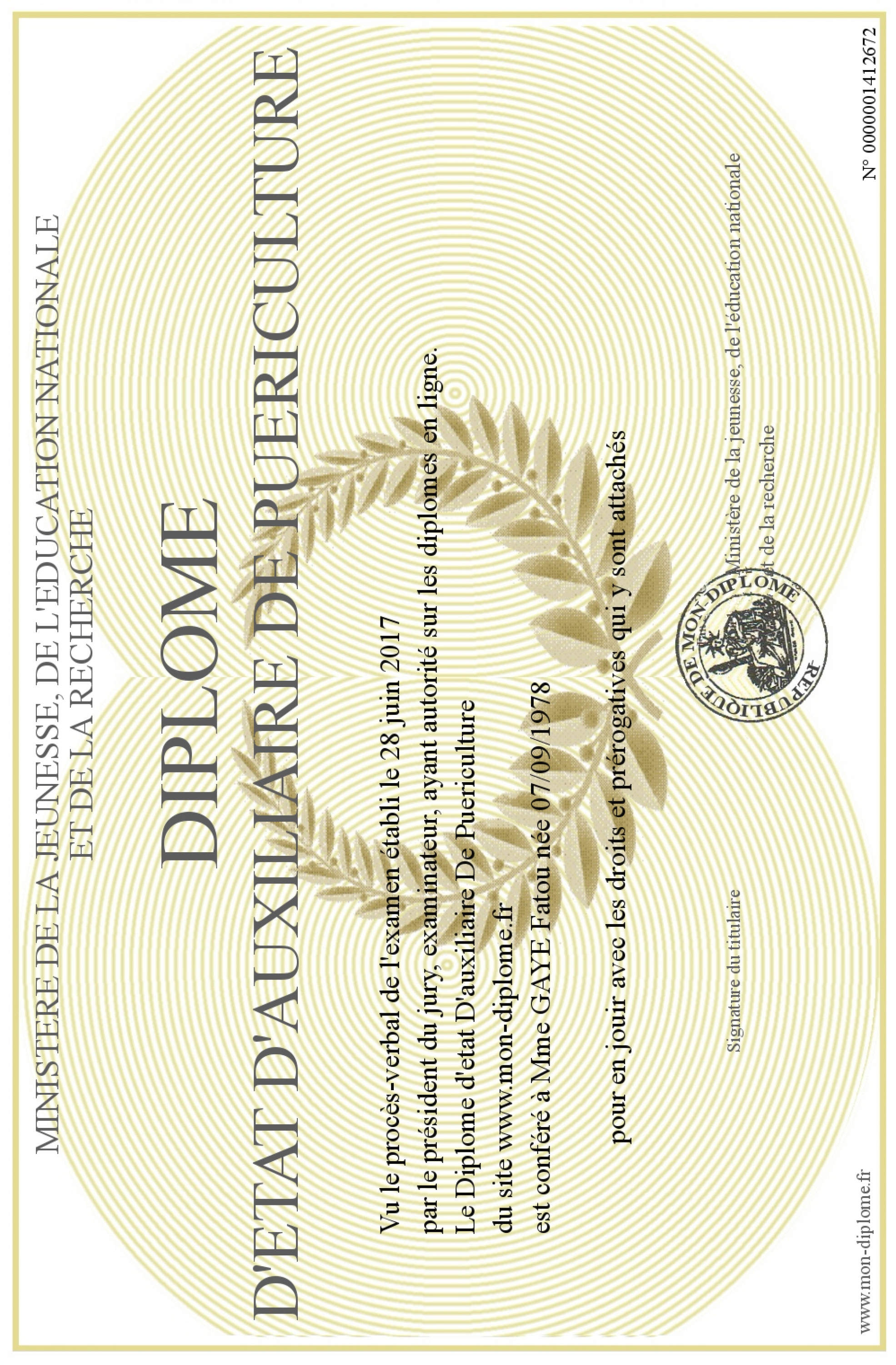 Envoyez par email votre Diplôme d'etat D'auxiliaire De Puericulture personalisé