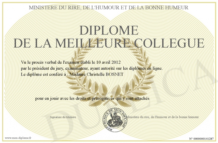 Envoyez par email votre Diplome de la meilleure collègue personalisé