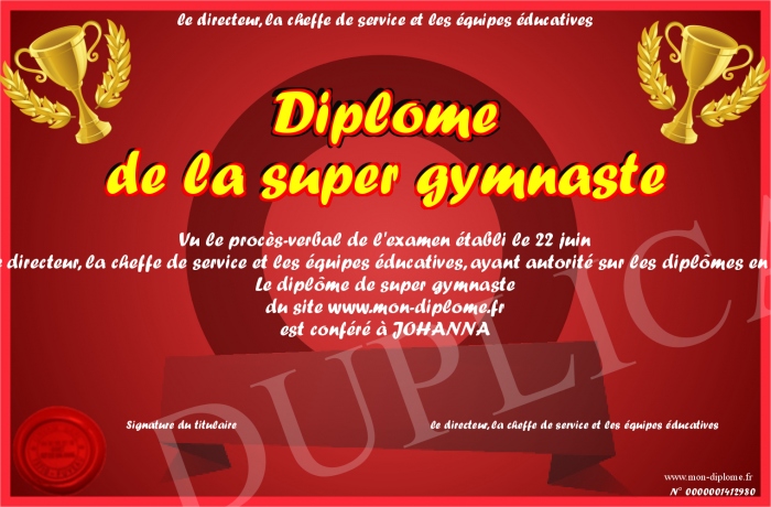 Envoyez par email votre Diplôme de la super gymnaste personalisé
