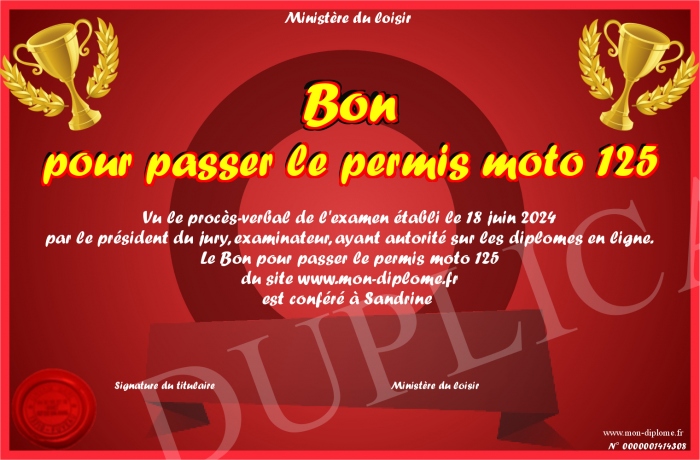 Envoyez par email votre Bon pour passer le permis moto 125 personalisé