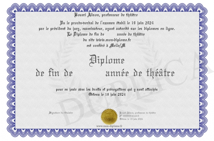 Envoyez par email votre Diplôme de fin de        année de théâtre personalisé