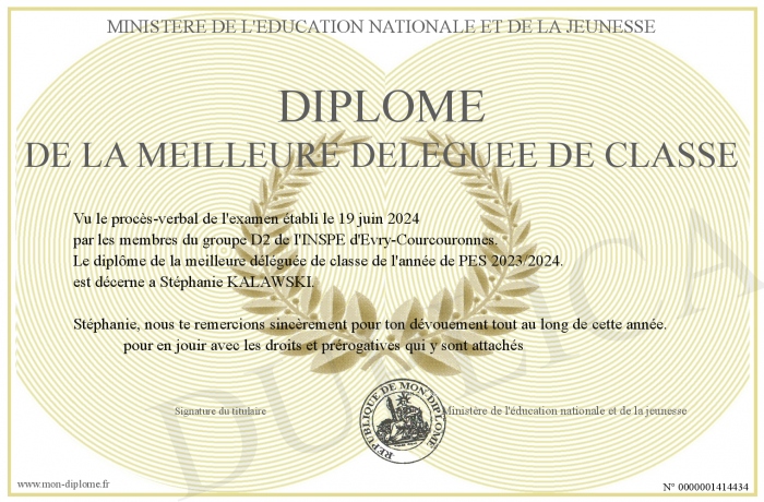 Envoyez par email votre Diplôme de la meilleure déléguée de classe personalisé