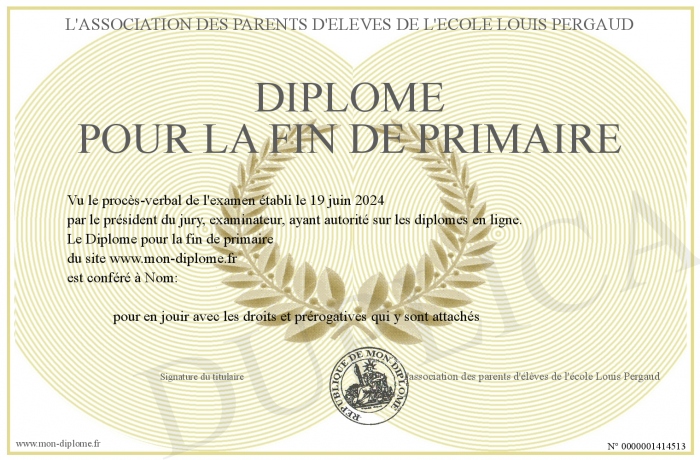 Envoyez par email votre Diplôme pour la fin de primaire personalisé