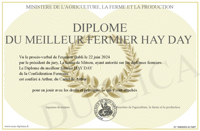 Envoyez par email votre Diplôme du meilleur fermier HAY DAY personalisé