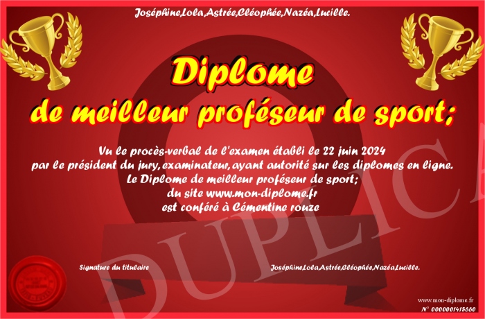 Envoyez par email votre Diplome de meilleur proféseur de sport; personalisé