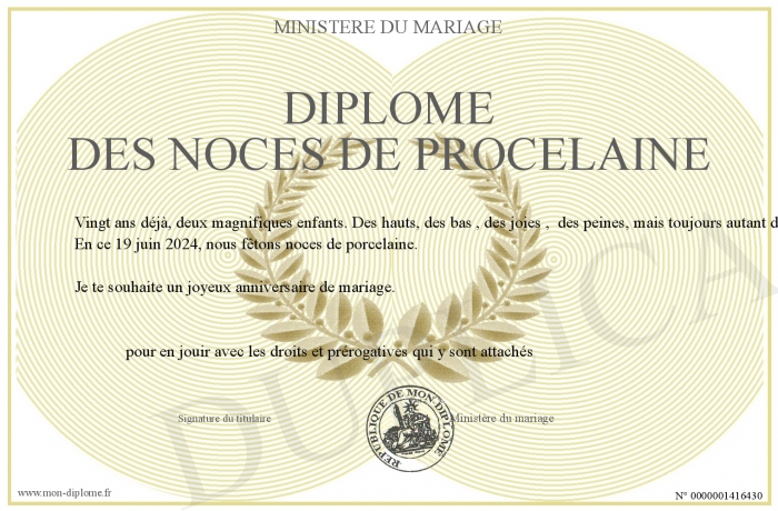 Envoyez par email votre Diplôme DES NOCES DE PROCELAINE personalisé