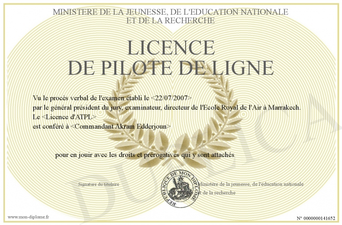 Envoyez par email votre Licence De Pilote de ligne personalisé