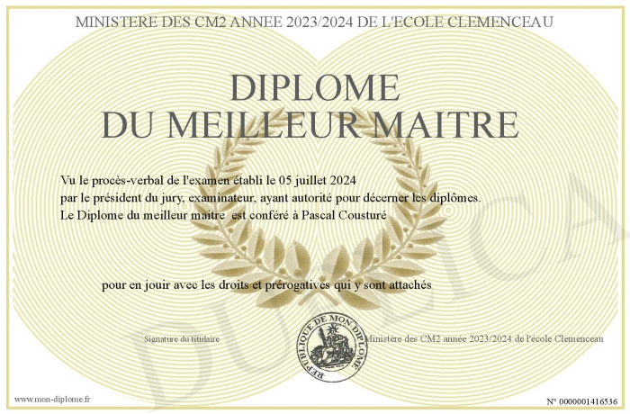 Envoyez par email votre Diplôme du meilleur maitre personalisé