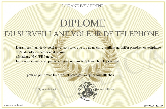 Envoyez par email votre Diplome du surveillant voleur de telephone. personalisé