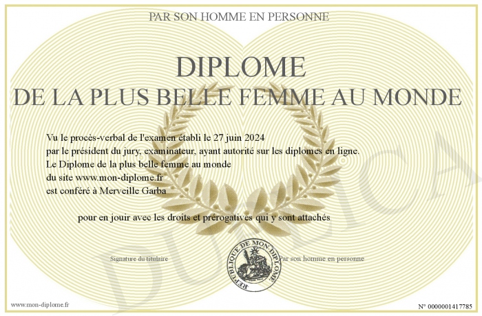 Envoyez par email votre Diplôme de la plus belle femme au monde personalisé