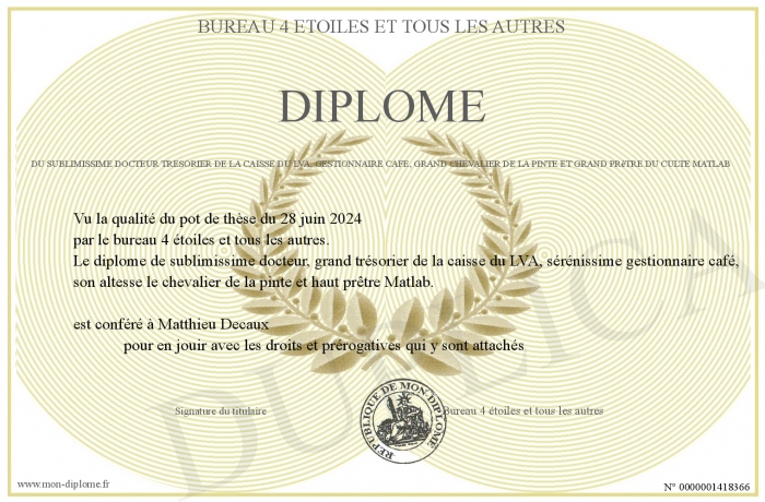 Envoyez par email votre Diplôme du Sublimissime docteur trésorier de la caisse du LVA, gestionnaire café, grand chevalier de la pinte et grand prêtre du culte matlab personalisé