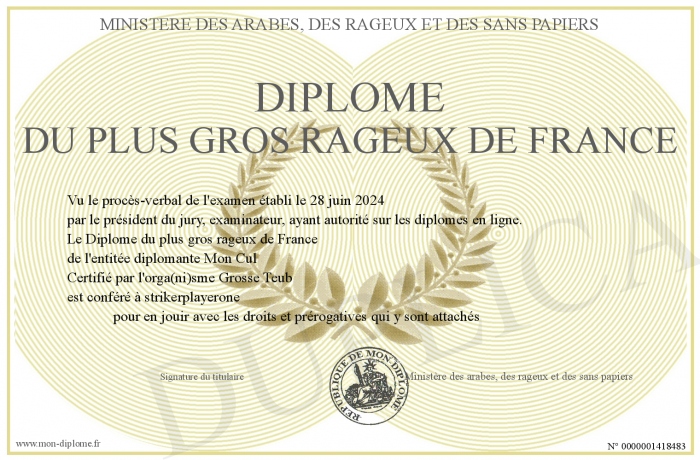 Envoyez par email votre Diplôme du plus gros rageux de France personalisé