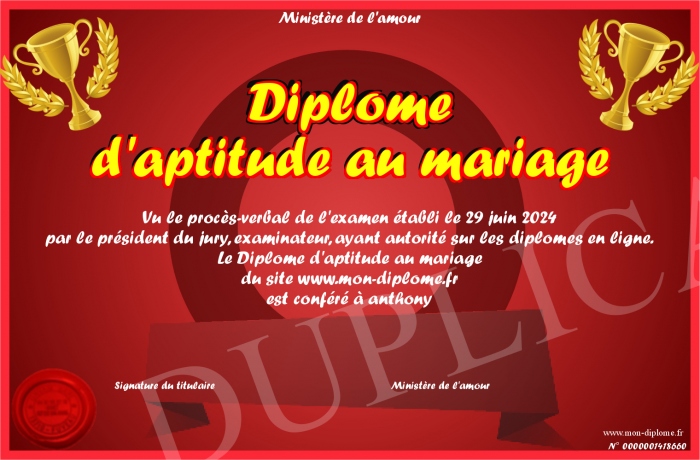Envoyez par email votre Diplome d'aptitude au mariage personalisé