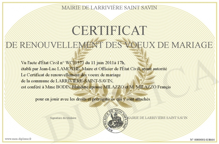 Envoyez par email votre Certificat de renouvellement des voeux de mariage personalisé