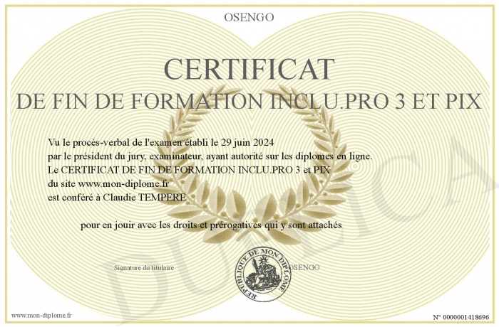 Envoyez par email votre CERTIFICAT DE FIN DE FORMATION INCLU.PRO 3 et PIX personalisé