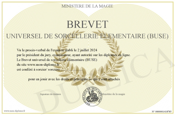 Envoyez par email votre Brevet universel de sorcellerie élémentaire (BUSE) personalisé