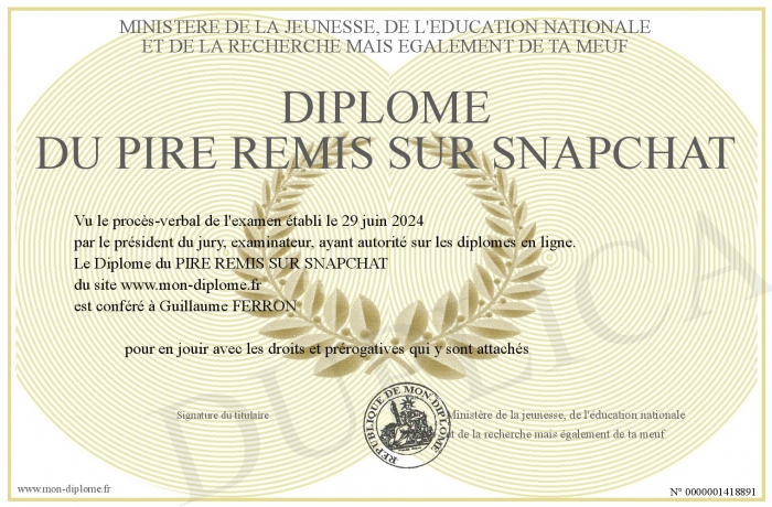 Envoyez par email votre Diplôme du PIRE REMIS SUR SNAPCHAT personalisé