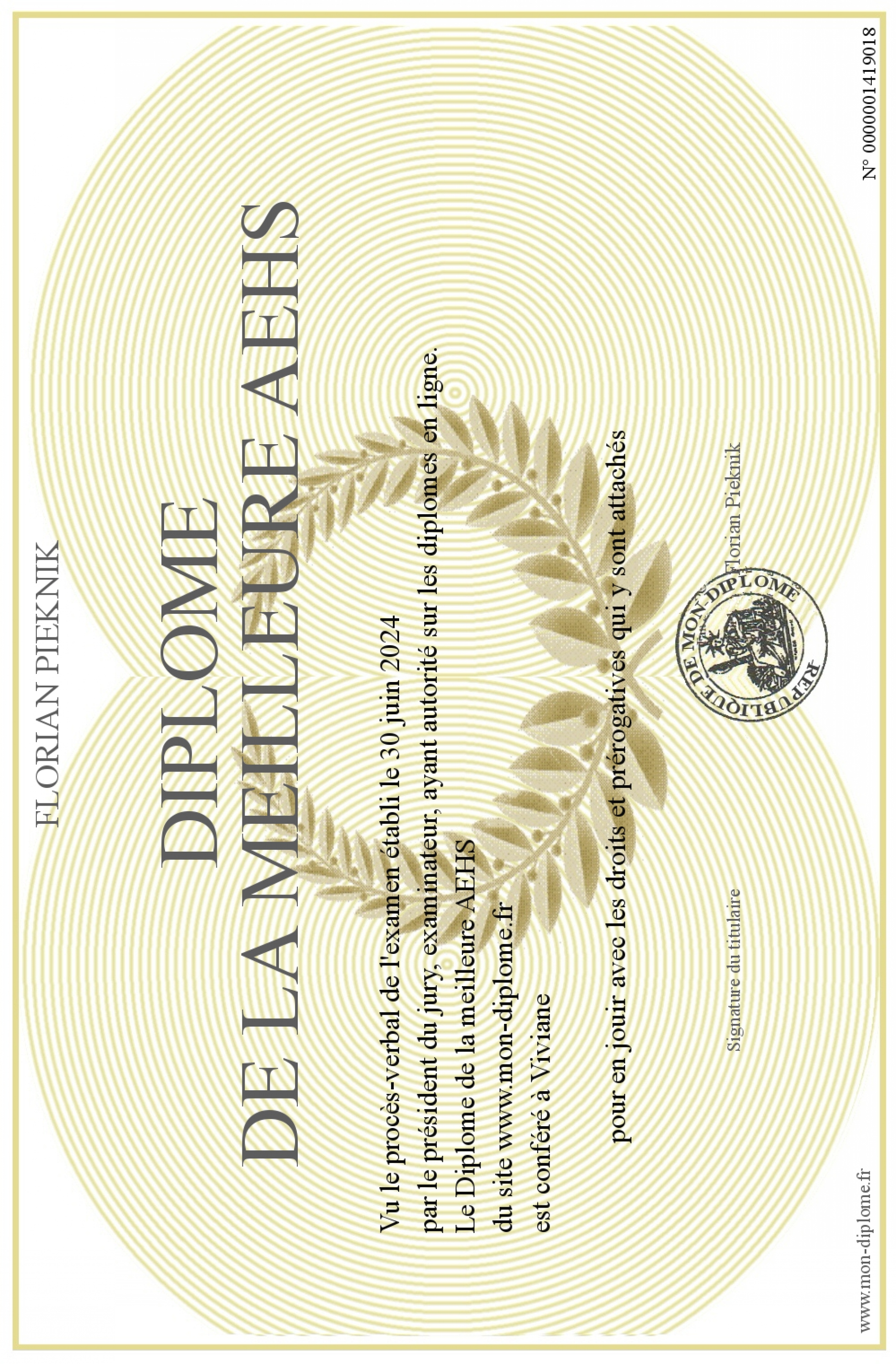 Envoyez par email votre Diplôme de la meilleure AEHS personalisé
