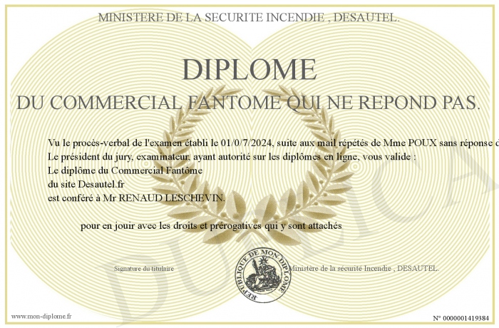 Envoyez par email votre Diplôme du Commercial Fantôme qui ne répond pas. personalisé