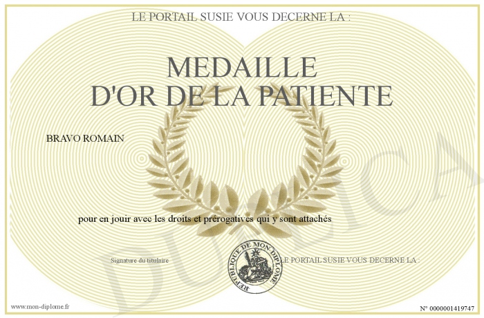 Envoyez par email votre MEDAILLE D'OR DE LA PATIENTE personalisé