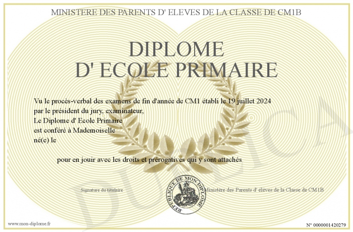 Envoyez par email votre Diplôme d' Ecole Primaire personalisé