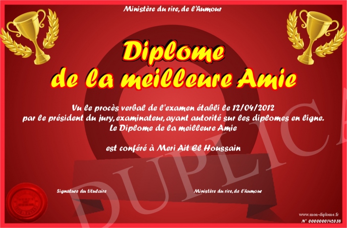 Envoyez par email votre Diplome de la meilleure Amie personalisé
