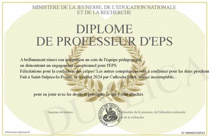 Envoyez par email votre Diplôme de PROFESSEUR D'EPS personalisé