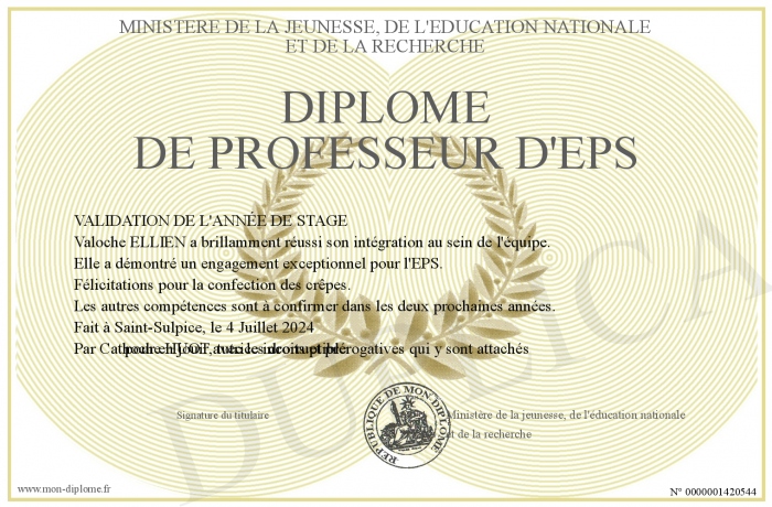 Envoyez par email votre Diplôme de professeur d'EPS personalisé