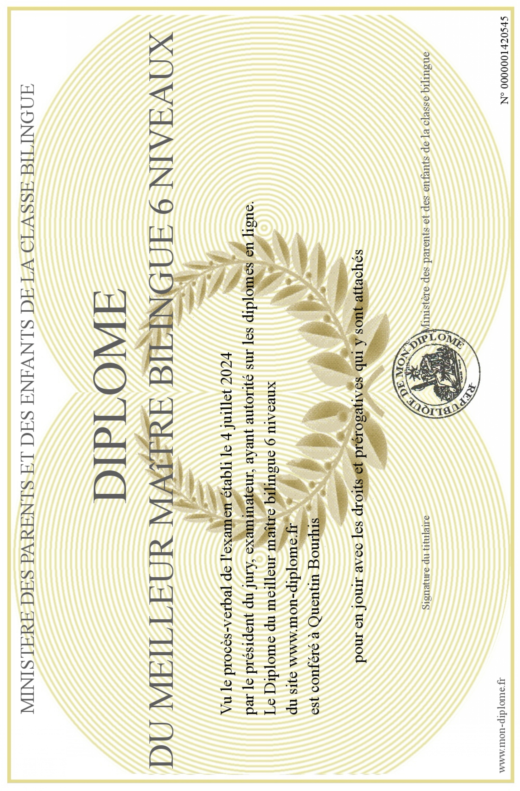Envoyez par email votre Diplôme du meilleur maître bilingue 6 niveaux personalisé